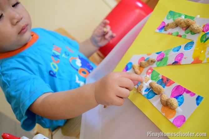 Here he is applying peanut shells on the letter N. Improves pincer grasp through picking up small objects. Note to parents: always supervise your children when dealing with small objects.